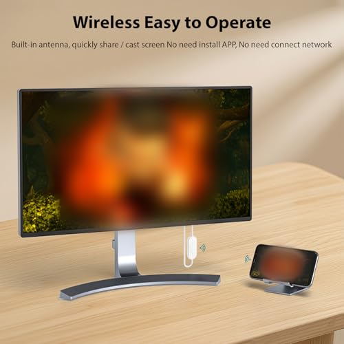 - Plug and Play: This wireless display adapter allows fast screen sharing without app installation or internet connection, thanks to its built-in antennas for seamless mirroring from any compatible device., Crisp FHD Streaming: Enjoy smooth 1080P FHD video and sound transmission with the high-definition dongle, delivering clear visuals and synchronized sound for presentations or entertainment., Universal Compatibility: The screen mirroring device works effortlessly among platforms, systems, supporting smartphones, tablets, and laptops with a single click, meeting various needs., Extended Wireless Range: With a stable 5GHz wireless connection, this casting stick maintains reliable performance up to 30 meters in open spaces, ensuring flexible placement near your display., Compact and Portable Design: The lightweight receiver (42g) fits discreetly behind screens with its slim 7.5cm body, excellent for travel or no-clutter setups in meeting rooms and living spaces.