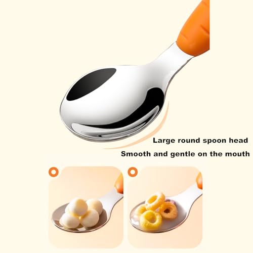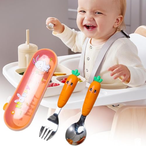 - Portable Storage Solution: This utensils set provides a portable storage solution through its dedicated box, preventing slippage while supporting cleanliness and hygiene anytime in an easily carried compact format, Utensil Quality: Crafted from food-grade stainless steel with smooth surfaces, meeting tableware standards, rust-resistant, retains shape for no worry dining safety and durability, Ergonomic Learning Tools: Tailored for food consumption, the utensils feature a smooth rounded spoon head that enhances comfort, assists in self-feeding development, and uses a balanced curve and groove style to guide positive eating routines effectively, Ritualistic Funny Elements: Brings a sense of occasion to mealtimes, using endearing cartoon motifs and soothing color palettes, ensuring look forward to their meals in a cheerful, interactive way, Easy Maintenance: Crafted with a one-piece molding process, the utensils set ensures heat resistant and no odor retention while preventing dirt accumulation for lasting cleanliness and easy maintenance