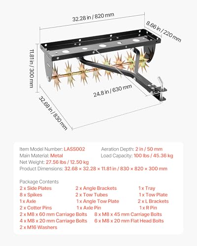 - 32-Inch Extra-Wide Working Width: This tow-behind core aerator features an ultra-wide 32-inch coverage, allowing you to aerate larger areas in fewer passes. Easily towed behind a lawn tractor or riding mower, it improves soil airflow and drainage to help your lawn recover faster, Reaches the Root Zone: Equipped with high-strength coring tines that penetrate up to 2 inches deep, this tow-behind spike aerator easily breaks through compacted soil. Suitable for dry, hard ground as well as clay and sandy soil types, More Efficient & Even Aeration: The tow behind plug aerator with weight tray supports up to 100 lbs of additional weight, helping the tines press deeper and stay stable for more consistent results. Built-in strap slots on the tray make it easy to secure sandbags or weights so they won't shift while towing, Heavy-Duty & Built to Last: Constructed from high-strength steel with a fully welded frame and reinforced hardware, this lawn aerator tool is designed to withstand long-term towing, muddy conditions, and outdoor exposure, Easy to Use: Our upgraded grass aerator features reinforced folded edges on both the front and back of the weight tray, helping securely hold cinder blocks or sandbags. The socket tool and wrench are included, allowing you to complete assembly quickly