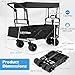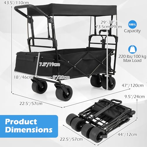- Spacious Storage Capacity: This collapsible garden cart offers a generous 100 L capacity inside (31.5" × 17.5" × 10"), keeping your outdoor necessities well organized. Secured by hook and loop fasteners, the removable bag, plus small side pockets, brings additional storage space for those smaller items., Removable Protective Canopy: Equipped with a canopy, the folding utility wagon shields from sun and rain to protect the stored items. The canopy's easy removal adds to flexibility, offering essential protection while also allowing customization based on specific situations., Adjustable Handle Design: Both the push and pull handles on this collapsible wagon cart are adjustable designed to satisfy the diversity of user preferences. This adaptability increases convenience and reduces strain, providing a comfortable handling experience., Large All-Terrain Wheels: Featuring wear-resistant and puncture-proof wheels, the outdoor utility wagon effortlessly traverses various surfaces including cobbled roads, grass, sand, and snow. The robust wheels ensure stable and smooth movement, making it dependable for rugged outdoor use., Reliable & Foldable Structure: Crafted from 600D Oxford cloth combined with a heavy-duty metal frame, this collapsible canopy wagon promises long-lasting strength and resilience. Additionally, the foldable design makes it easy to carry and transport, ideal for various activities like gardening, camping, RV trips, and shopping.