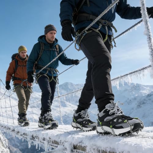 - Enhanced Traction Performance: Ice grips for shoes with a 22-point crampon structure design provide excellent grip on ice and snow, reducing slip risk on steep terrain while ensuring stability during winter hikes or commutes, enhancing safety in icy conditions without adding unnecessary weight to reduce foot fatigue, All-Environment Adaptability: Snow grips for boots combine martensitic steel and TPE elastomer to create impact-resistant traction tips, offering a durable yet flexible fit that conforms to various shoe designs, ensuring reliable grip on mixed surfaces such as icy roads or snow-covered paths during outdoor activities, Winter Traction Security: Shoe spikes crafted for icy terrains ensure stability by resisting brittleness even in extreme cold, providing dependable support during spring thaws and snow-covered walks, enhancing confidence on uneven winter trails, Scratch-Free Coating: Ice snow grips feature a TPE coating that prevents scratches on ground areas while ensuring durability, making them ideal for variable terrain hikes and outdoor expeditions where ground protection matters most, Secure Grip Across Generations: Ice shoes grippers feature elastic straps and heel buckles to deliver a tailored fit for both children and adults, ensuring stability during demanding outdoor activities and enhancing safety for family ice adventures in icy conditions