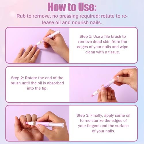 - Package List: You will receive 2 pieces of 2 in 1 cuticle oil pusher pens for daily use or replacement. Suitable for natural nails, gel nails, acrylic nails, and professional nail care routines., Portable Design: Compact and lightweight, measuring approximately 12.6x1.2x1.2cm/5x0.47inx0.47in, this nail care pen fits easily in purses, cosmetic bags, or travel kits. Perfect for quick touch-ups at work, during travel, or post-manicure to maintain salon-quality nails anytime., 2-in-1 Nail Care Efficiency: This all-in-one nail care pen combines a ceramic cuticle pusher and nourishing oil applicator. It cleans dead skin, moisturizes dry cuticles, and strengthens fragile nails in one step, eliminating the need for multiple products., Gentle & Effective Cuticle Care: Featuring a finely textured ceramic tip, our cuticle pusher gently exfoliates without damaging delicate nail beds. The integrated oil pen releases a blend of jojoba oil and vitamin E to soften cuticles, reduce hangnails, and restore natural shine., Easy Twist to Use: Gently rub the ceramic tip to remove dead cuticles, no pressing required. Simply twist the pen to release nourishing oil, then apply along cuticle edges and nail surface for quick, clean, and mess-free nail care. Warm Tip: Shake the pen 2-3 times before use for better oil flow.