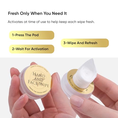- Press-to-activate pod: Individually packaged wipes with sealed solution; press the center until it clicks to infuse the wipe for a fresh clean anytime. Great for travel, commuting, restaurants, and everyday quick cleanups, Refreshing daily clean: A convenient option for quick hygiene touch-ups at work, after meals, or on public transit. Designed for frequent use when you want a clean, refreshed feel and do not have time for a full wash, Hands and face, anywhere: Use during flights, road trips, camping, and festivals. Keep in your bag for lunch breaks, coffee runs, sticky fingers, and quick freshen-ups before meetings, errands, or after outdoor activities, Compact and easy to store: Keep pods in purses, backpacks, lockers, desk drawers, and glove boxes. Individually packaged wipes stay ready until use; no bulky packs and no worries about wipes drying out between uses, 30-count value box: Stock up for daily carry and restocking at home, work, and in the car. For external use only; avoid contact with eyes and sensitive areas. Store at room temperature and do not flush