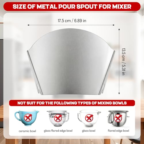 - PRACTICAL POURING SLOT & SPLASH PREVENT: This mixer pouring chute helps ingredients pour more efficiently into the bowl, preventing spills on the countertop or bowl walls, reducing waste, and ensuring thorough mixing. The stainless steel pouring chute also prevents splashing, reducing cleaning time and keeping the kitchen tidy and organized, SCIENTIFIC DESIGN: This pouring chute for mixer features a wide pouring channel and leak-proof side wings, allowing for easy addition of various ingredients, ensuring any food enters the bowl completely. It also features a fixing slot for secure attachment to the mixing bowl's edge, EASY TO USE: The double fixing slot design makes installation easy; simply insert the pour spout for mixer bowl into the desired position and press to secure. Dishwasher safe after use, saving time and effort, PREMIUM MATERIAL: Made of high-quality stainless steel, this metal bowl pouring chute is corrosion-resistant, scratch-resistant, durable, and fade-resistant. The safe material is suitable for handling various food ingredients, WIDELY APPLICABLE: This pouring chute for mixer accessories measures 13.5*17.5cm / 5.31*6.89in, making it highly compatible with most stainless steel mixing bowls. It is not suitable for corrugated mixing bowls, flared mixing bowls, or glass bowls