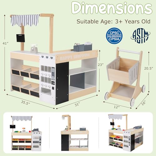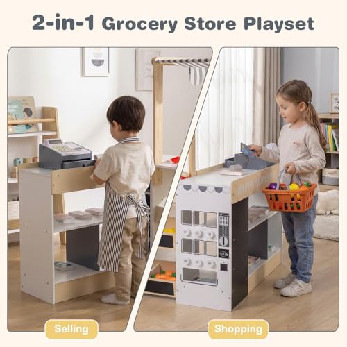 - 【2-in-1 Supermarket Role Play】Designed as a 2-in-1 grocery store playset, this wooden play store allows kids to switch between shopping and cashier modes for immersive pretend play. Children can act as shoppers filling the cart or cashiers running the checkout, building social interaction and communication skills through everyday supermarket scenarios., 【Interactive Checkout & Scanner】Featuring a 23" countertop height that fits children comfortably, this kids grocery store includes a solar-powered cash register and a light-and-sound scanner to recreate a realistic checkout process. With play money and a credit card, children naturally practice counting and basic math during grocery store pretend play., 【Vending Machine & Shopping Cart】This toy grocery store is packed with fun. Kids can select drinks, press the button and collect their items, adding excitement to pretend grocery store play. The shopping cart allows children to transport multiple groceries around the playroom, while smooth-rolling wheels and an easy-grip handle support coordination and independent movement., 【Rich Play Food & Accessories】This toddler grocery store has abundant accessories, including lemons, apples, bananas, eggplants, carrots and green peppers, along with a scale, knife and drink set for realistic role play. In this interactive play grocery store, children can sort, weigh and “cut” fruits and vegetables, strengthening fine motor skills and hand-eye coordination., 【Ample Storage & Kid-Friendly Design】Crafted from sturdy wooden boards and compliant with ASTM/CPSIA standards, this kids play store is built for safe play. Front display shelves, side storage racks and 2 blackboards help organize accessories and showcase special offers in your store. Ideal for ages 3+, this supermarket playset for kids makes a thoughtful gift for birthdays and holidays.