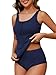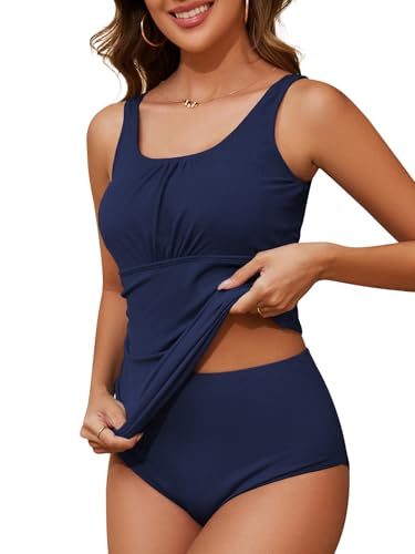 American Trends Women Ruched Tummy Control Bathing Suits Two Piece Swimsuits Modest Tankini Tops with Bottom Navy Blue L