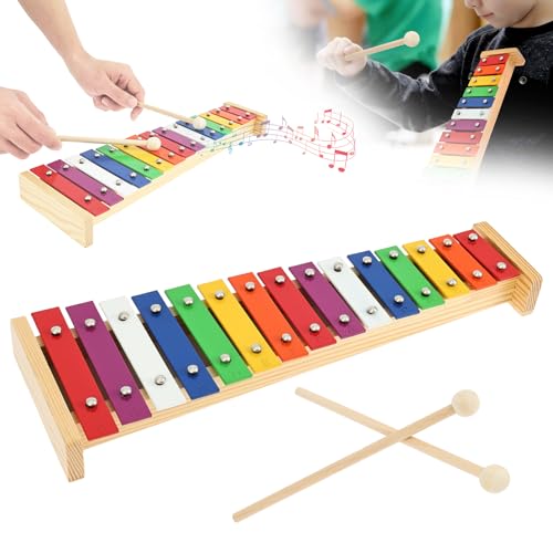 - 【 Precise Intonation and Clear Tone 】 This colorful and sturdy xylophone features finely crafted , brightly colored metal keys that produce clear tones . Let kids unleash their creativity and play amazing , magical melodies with ease, 【 Safe and Sturdy Design 】 Made of wood , this kids xylophone is safe for children . The wood is smooth , when the keys are tightly attached . Suitable for kids aged 3 and above, 【 Vibrant Color Scheme 】 The 15 tone xylophone comes with multi colored keys in , saturated hues . It can play most pop songs , classical pieces , and folk music, 【 Long Lasting Companion 】 Crafted from premium wood and aluminum plates , the xylophone is built for last . When the mallet head is securely attached to the handle , it resists breaking or cracking . Expertly processed with exquisite craftsmanship , it will accompany your child's growth for years, 【 Educational and Entertaining 】 Allowing young children to play the xylophone , a classic musical instrument , is an excellent way to unlock their musical potential . These , colorful note keys quickly capture the attention of little music lovers , greatly boosting their creativity and supporting healthy cognitive development