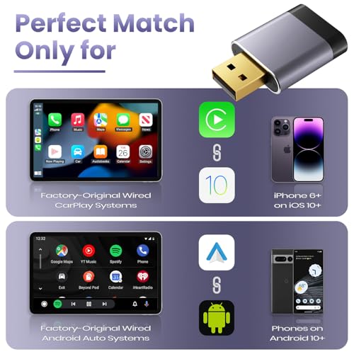 - 【Universal Compatibility & 2-in-1 Upgrade】 Instantly transform your 2016+ factory-wired vehicle into a wireless powerhouse! This 2-in-1 Wireless CarPlay & Android Auto Adapter offers a seamless transition for both iPhone (iOS 10+) and Android (11+) users. Equipped with dual USB-A/C ports and lifetime firmware updates, it ensures your system stays current. Note: Engineered for original wired cars; not compatible with BMW or Tesla., 【Seamless Wireless Upgrade in Seconds】: Transform your drive with this wireless CarPlay adapter—perfect for commutes, or weekend trips. Plug into your car's data USB port, pair via Bluetooth, and in under 30 seconds enjoy wireless music, maps, and calls. Keep your phone charging and your car cable-free. This 2025 Mini wireless CarPlay adapter delivers instant connectivity and lasting convenience, making every journey smoother with reliable Wireless CarPlay & Android Auto, 【Gold-Plated Superiority & Rock-Solid Link】 Stability is our priority. Featuring advanced gold-plated USB connectors, our wireless carplay adapter for Apple and Android delivers faster, more reliable data transfer than standard ports. This premium hardware ensures a rock-solid connection that won’t drop during highway drives or urban navigation, providing professional-grade plug and play reliability every time., 【Cool & Stable Dual-Core Performance】 Don't let overheating ruin your drive. Unlike basic dongles that lag, our car play wireless adapter features a high-end dual-core chip that stays cool during 12-hour summer road trips or heavy winter usage. This efficient heat dissipation ensures smooth, uninterrupted music streaming and real-time GPS updates across all seasons and terrains., 【Ultra-Compact & Seamless Integration】 Designed for the modern driver, this ultra-slim wireless carplay adapter features a discreet, high-end aesthetic that blends perfectly with your car’s interior. No bulky hardware, no messy wires—just a clean, elegant cabin. Its mini footprint delivers instant connectivity for school runs or errands, keeping your phone connected while your dashboard stays pristine., 【Smart Audio & Effortless OEM Control】 Take command with ease. This versatile carplay wireless adapter fully supports your vehicle’s original steering wheel controls, touchscreen, and voice assistants (Siri/Google). Enjoy crystal-clear hands-free calls and turn-by-turn navigation without losing the tactile feel of your factory buttons. It’s the smartest way to stay entertained and focused on the road., 【3-Step Quick Connect & Auto-Reconnect】 Experience true wireless freedom in 3 simple steps: Plug, Pair, and Play! After the initial setup, this wireless CarPlay dongle automatically reconnects to your phone in just 5 seconds whenever you start the car. No repeated pairing or manual toggling required—just keep your Bluetooth and Wi-Fi enabled for a truly automated driving experience.