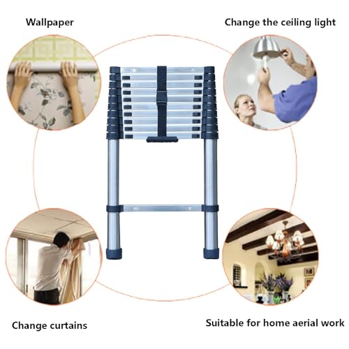 - 【Telescoping Ladder 10 FT 】: Extension ladder fully extended from 2.6ft to 10.5ft, 11 steps, step distance is 11inch, gross weight is 10.1kg, extend height: 10.5ft, easy to store, convenient for luggage or car, sofa gap., 【Collapsible Ladder】: Independent Locking, with separate locking bottoms on rungs 2 to 10, eliminating the hidden danger of hand jamming. It can be fully expanded into a straight ladder with a working height of 10.5ft., 【Rubber Non-Slip Feet】: Max load capacity is 330lbs / 150kg. Rubber anti-slip foot pads effectively increase friction and achieve the purpose of anti-slip. It is very suitable for building decoration, window washing, painting, etc., 【Lightweight & Easy to Store】: G.W. approximate 10.1 kg, folded and stored flat easy to store and transport, one person can move it around easily. You don't need to assemble it yourself, you can use it immediately after receiving it., 【Versatile Ladder】: Approved by safety standard EN131. Used for ceiling replace light bulbs, decorate birthday parties, office, kitchen, warehouse, clean, build trees, flowers, etc.