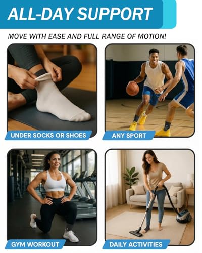 - Exceptional Value with 4-Pack Bundle: Get 4 premium ankle braces in one convenient pack, perfect for keeping one in your gym bag and one at home. This cost-effective solution ensures you always have backup support ready, whether for daily wear, sports, or recovery, Comprehensive Pain Relief for Active Feet: Designed to alleviate discomfort from plantar fasciitis, tendonitis, arthritis, and sprains, this ankle brace provides targeted compression that helps reduce morning heel pain and soothe inflammation. Whether recovering from an injury or managing chronic foot conditions, it offers reliable support for everyday relief, Secure Athletic Stabilization for Sports: Built for high-impact activities like basketball, volleyball, and running, this ankle stabilizer features a figure-8 strap system that locks in support without restricting natural movement. It helps prevent rolling and twisting during jumps and quick cuts, giving athletes confidence in every step, Breathable All-Day Wear with Customizable Fit: Made from premium moisture-wicking fabric, this compression sleeve keeps feet dry and comfortable throughout the day. The adjustable strap allows you to dial in the perfect compression level, while the unisex stretch-to-fit design ensures a non-slip fit that stays put inside shoes, Supports Circulation and Faster Recovery: Graduated compression technology promotes healthy blood flow to reduce swelling and fatigue, making it ideal for post-injury recovery or long days on your feet. It also enhances proprioception, helping your body maintain better joint awareness during movement