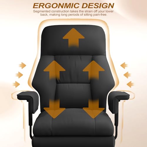 - SUPER COMFY: Stuffed with a high-density sponge, the cushion of the seat and back offers a softer and more comfortable sitting experience. Featuring scratch resistance leather, this reclining office chair is both beautiful and durable. It is very easy to clean by gently wipe it with a damp cloth., ERGONOMIC SUPPORT: This executive office chair features an ergonomic design that provides optimal neck and lumbar support to help your body keep straight and prevent slouching. Padded linkage-type engineering armrest can provide strong support for the arms while it is tilted back, and get rid of the awkwardness of the traditional armrest that the arm is dangling., GREAT DURABILITY: Our high back computer gaming chair is equipped with high-quality gas lift, smooth swivel and rolling capabilities. Supported by a heavy duty metal 5-point base, this desk chair can hold up to 330 lbs, providing excellent support and safe use. In addition, the smooth rolling wheels make it easy to move the chair anywhere., FUNCTIONAL: You can lean back and relax by easily tilt back or lock in the correct position with the tilt locking mechanism. Our wide office desk chairs feature adjustable angles(from 90° to 130°) and 3.93” height adjustment. You can lean against the back in different positions or adjust the seat to your desired height. Besides, Retractable footrest is a great bonus that allows for relaxing your legs., EASILY PUT TOGETHER: All necessary parts, tools, hardware, and instructions are included in the package. The swivel work chairs can be easily assembled with the high-quality screws and bolts. Ideal for working, reading, and more, this home office desk chair can be used on various occasions for added comfort and convenience.