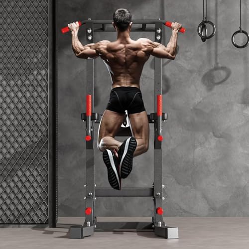 - 【Super Sturdiness and Stability】Our power tower is constructed from strong steel material and features 4 stable suction cups, ensuring a maximum weight capacity of 330 pounds, staying stable without any wobbling or shaking, ensuring that your workout is safe and effective. It gives you confidence and security during your workout, no matter what exercise you do. Even with regular use, the tower will not show any signs of wear and tear and will be able to withstand your intense workout routine., 【7 Levels of Height Adjustment】With 7 height adjustment options ranging from 65.7 to 78.7 inches, this SOGES Power Tower accommodates the entire family's workout needs and can be used at home, in the office, and in a variety of other settings, providing a customized workout experience for individuals at any fitness level. The pull-up bar station has a compact design that makes it easy to use in home gyms with limited space. Ideal for those with limited space., 【Comfort and Safety】This strength training fitness workout station is equipped with elbow pads and back pads, providing additional comfort during exercises such as bending and stretching, reducing the burden on your joints, and making your exercise experience more enjoyable.The design of plastic gloves has anti slip characteristics. Whether you are sweating or doing high-intensity exercise at the time, it can ensure your comfort and safety during exercise, 【All-around Exercise Gym Equipment:】This versatile equipment allows you to perform a wide range of exercises, including pull-ups, push-ups, leg raises, dips, vertical knee raise and more. Target your leg, chest, shoulder muscles, and enhance your upper body strength with ease. This versatile design makes it the ideal multi-functional solution for targeting different muscle groups for a total body workout, 【Excellent Customer Service】 We are committed to providing exceptional after-sales support to ensure your satisfaction with our product. Feel free to contact us with any questions or concerns regarding your power tower pull up dip station., 【NOTE】Please assemble this dip rack from the bottom up. Please tighten the screws after installing all parts. Please do warm up exercise before use.