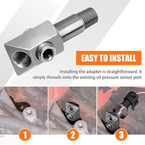 - Wide Application: Adapter for oil pressure sensor, 1/8-27 NPT thread, suitable to fit for Small Block 305/350 engine. Easy installation for oil pressure sensor and other sensors. Provides enough installation space and saves time., Main Functions: Oil pressure adapter with 1/8-27 NPT male thread interface for cylinder connection. Two 1/8-27 NPT female thread interfaces at 45 and 90 degrees for sensor connections., Quality Material: Made of sturdy stainless steel, oil pressure sensor adapter is designed to withstand the rigorous requirements of engine compartments and high pressure oil systems, ensuring long lasting performance., Easy Installation: Simply screw the adapter into the existing oil pressure sensor interface. The adapter design provides more space for sensor installation. No drilling or major modifications required., Strong Structure: 1/8-27 NPT port plug is made of excellent stainless steel material, possess good mechanical properties and high strength, ensure long lasting performance.