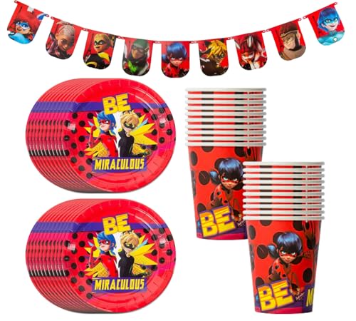 Miraculous Ladybug Party Kit - 20 Plates, 20 Cups, & 1 Banner - Cat Noir - Party Supplies - Officially Licensed