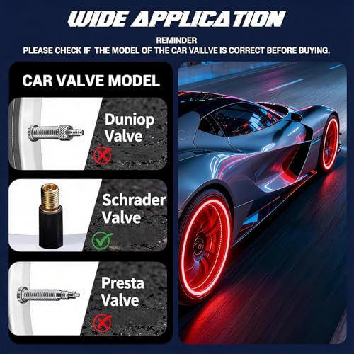 - Premium Materials: The car tire dust caps are made of high-quality ABS material, which is scratch-resistant, highly stable, and durable., Gorgeous Luminous Effect: Fluorescent tire valve caps absorb light during the day and emit light at night. As your car travels on the road, the rapidly rolling tires create a dazzling luminous effect in circles, greatly enhancing the car's overall appeal. With these tire valve caps, your car will become the most eye-catching presence on the road!, Double Protection: This glow-in-the-dark tire valve cap truly achieves both aesthetics and functionality. The rubber seals inside the tire valve cap create a very tight seal, effectively preventing dust and dirt from entering the valve., Easy Installation: The installation of the tire caps for car are very simple and requires no tools. The package includes 20 tire valve stem caps, enough to meet the installation needs of all your transport vehicles., Wide Application: These tire valve caps are compatible with most of the models on the market, including cars, trucks, SUVs, vehicles, motorcycles and bicycles.