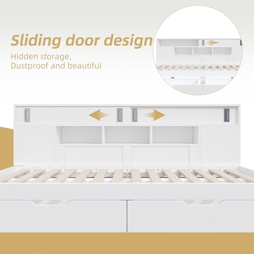 Eqsalisu Full Size Daybed (54"x75") with Under-Bed Storage Drawers and Built-in Shelves, Multifunctional Bed Frame for Small Bedroom and Guest Room, White Finish, No Mattress Included