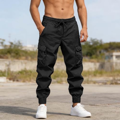Mens Cargo Pants Athletic Joggers Elastic Waist Multiple Pockets Sweatpants Ankle Cuffs Casual Outdoor Workout Trousers Black