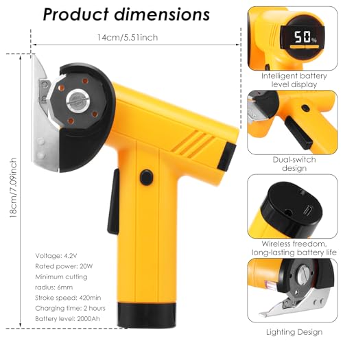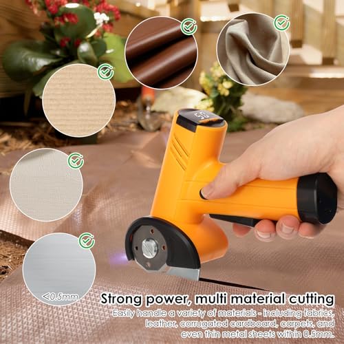 - 【Strong Power】 Equipped with a high torque brushless motor and high hardness stainless steel blade , it can easily handle various materials including fabric , leather , corrugated cardboard , carpets and even thin metal plates within 0 .5mm . The cutting process is smooth and stable , with neat and burr free edges , significantly reducing hand burden and improving work efficiency, 【4 Speed Adjustable】 It features 4 adjustable speeds to flexibly adapt to different task needs . Low speed is for fine sewing , quilting and curve cutting , medium speed is for indoor soft packaging and packaging material processing , high speed is for batch fabric cutting and light metal rapid cutting . At the same time , the built in LED power indicator screen displays the remaining power in real time to avoid work interruption, 【Long Battery Life】 Adopting a high performance rechargeable lithium ion battery , it supports long time continuous operations . The included USB charging cable allows you to charge at any time via computers , power banks or car interfaces , especially suitable for efficient processing of large size fabrics or multi piece projects, 【Safe and Reliable】 Integrated with a safety lock switch to avoid accidental startup . It is equipped with a detachable blade guard to ensure safe storage and carrying . The set includes spare blades to extend the service life of the tool . The overall structure is sturdy , combining professional strength and daily reliability , making it an ideal upgrade for manual scissors or small reciprocating saws, 【Ergonomic Lightweight Body】 Optimized weight distribution and holding angle , the whole machine is lightweight and balanced , not easy to fatigue during long time operations . It is especially suitable for users with weak hand strength , arthritis patients or users who pursue high efficiency and labor saving