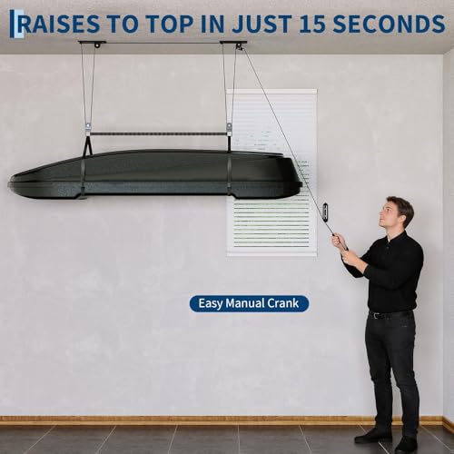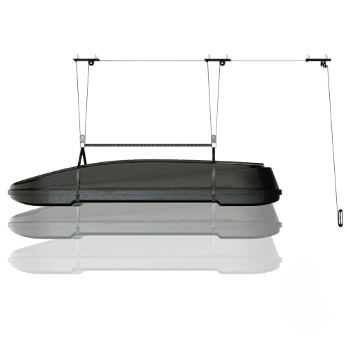 - Maximize your garage’s overhead storage with this heavy-duty Cargo Box Garage Pulley System and Ceiling Mounted Storage Racks, supporting up to 200 lbs for cargo boxes, bins, and outdoor gear., Engineered for 8–18 ft ceilings, this system offers flexible installation and versatile placement, keeping bulky items safely suspended and your garage floor clear., Adjustable webbing straps and reinforced rope securely lift a variety of rooftop carriers, kayaks, and totes, adapting to different shapes and sizes with comfort., DIY-friendly installation mounts directly to ceiling joists, creating a stable, long-term storage solution with minimal tools for both home and garage organization., Dual fixed-point design reduces sway and maintains balance, offering a reliable, space-saving way to store heavy gear overhead and optimize valuable parking space.