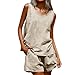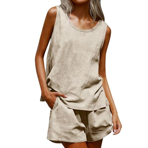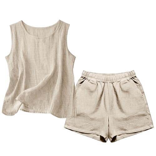 Women's 2026 Summer 2 Piece Linen Short Sets Sleeveless Crewneck Tank Tops Matching Sets Athletic Workout Gym Beach Outfits with Pockets