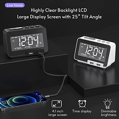 - [Digital Alarm Clock] With 2 sets of alarm clock, satisfying different wake-up times needs of parents and children; also support one-button snooze for extra sleeping; there are 3 ways for waking up: “BE...BE...” sound, chords, and radio., [FM Radio Function] Support automatically search and store radio stations after entering radio mode, you can listen to news, music, and stories in your time; besides, there are 2 USB ports for charging smartphone, tablets, and more., [BT 5.0 Speaker] With 10 meters large transmission distance, compatible with smartphones, tablets, and computers, easy to connect; also display U disk play, you can listen to your favorite music in multiple ways., [LCD Large Display Screen] The font is big and clear, easy to read, with adjustable brightness, low light mode is perfect for night, does not disturb your sleeping; also support temperature and weekday display., [2 Ways of Power Supply] USB type-c port, easy to get powered through AC adapter, computer, power bank, and more; support AC adapter power supply; generous and good-looking appearance design, a nice decoration for home.
