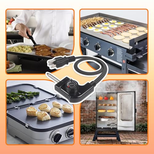 - Customizable Heating Management:Equipped with an adjustable temperature dial and heavy-duty 16AWG wiring,this 125V adjustable controller thermostat probe cord delivers consistent thermal performance for precise cooking control across various appliances.With Precise Temperature Control,170±10°C adjustment, Broad Appliance Compatibility:Designed to work for Masterbuilt electric smokers models MB20070210 & MB25075517 and most electric griddles,serving as a versatile replacement component for multiple kitchen devices, Professional-Grade Construction:This temperature control probe power cord features a commercial-grade stainless steel sensing probe that maintains accurate temperature readings and withstands prolonged exposure to high-heat environment, Enhanced Safety Design:Incorporates a visual power indicator and sufficient cord length to maintain safe operating distances,providing peace of mind during outdoor cooking sessions, Tool-Free Setup:Engineered for immediate use with straightforward plug-and-play connectivity,enabling quick replacement of existing components without technical expertise or additional tools