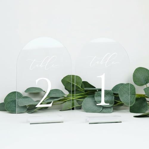 - Complete Set for Your Event: This package includes ten (10) elegant 5x7 inch clear acrylic arch table numbers, 1 through 10, each paired with its own sturdy 3-inch acrylic stand for immediate display., Versatile for Any Celebration: weddings, use these modern acrylic table numbers for anniversaries, bridal showers, baby showers, birthday parties, or formal dinners to organize and elevate your occasion., Simplify Guest Seating: These clear table numbers with stands help guests find their seats effortlessly. Their elegant also enhances the overall aesthetic of your tablescape and event decor., Crafted for Clarity & Durability: Made from premium clear acrylic, each sign is precision laser-cut with smooth edges. The numbers are printed using a crisp, eco-friendly UV process that resists fading and scratching for lasting beauty., On-Trend Modern Design: Featuring a graceful arch shape and clean, minimalist , these acrylic wedding table numbers a contemporary look that complements any wedding theme, from rustic barn to classic ballroom.