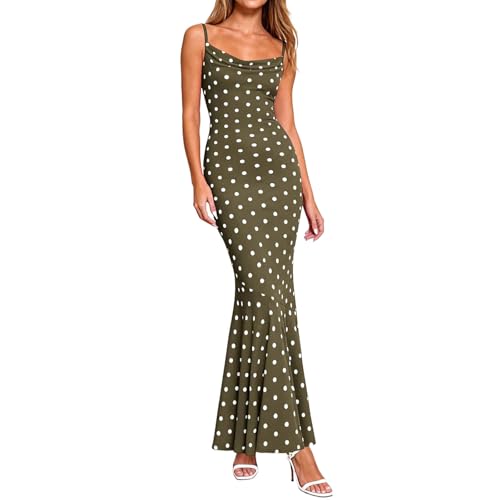 Womens Summer Dresses Polka Dot Spaghetti Strap Cowl Neck Bodycon Wedding Guest Cocktail Mermaid Maxi Dress Vacation Army Green-XL