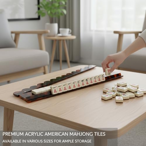 - Enhance Your Game Night: A practical and stylish accessory for both casual and serious mahjong players, helping to keep your playing area neat and your focus on the game., Stable & Reliable Acrylic Build: Crafted from clear, sturdy acrylic, this mahjong tile rack provides a stable base and is built to last through many game nights., Elegant Wavy Design & Rich Finish: This mahjong rack features a distinctive wavy edge and a brown tortoiseshell pattern, providing a visually appealing and sophisticated look to your game table., Perfect Fit for American Tiles: Specifically sized to accommodate standard American mahjong tiles, ensuring a snug and organized arrangement for a smoother gaming experience., Convenient Magnetic Pushers: Integrated magnetic pushers securely hold your tiles in place during play and can be easily detached for effortless tile setup and cleanup.