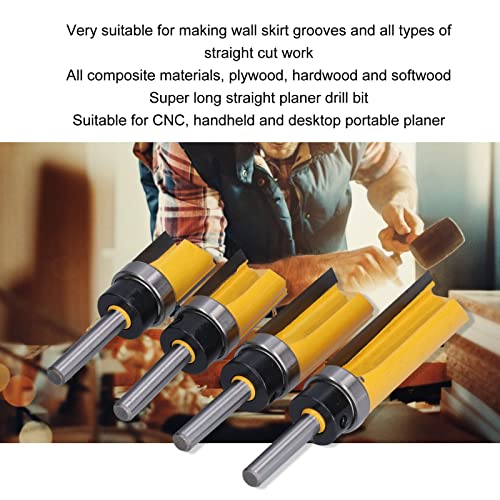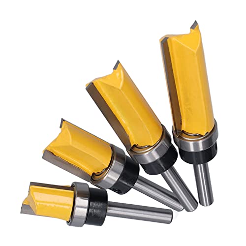 - Precision Flush Trimming: This flush trim router bit delivers clean, accurate straight cuts ideal for trimming laminates, veneers, and banding flush with the workpiece surface, ensuring professional results every time with your woodworking projects., Versatile Routing Performance: Designed for use on hardwood, softwood, plywood, and composite materials, this straight pattern bit works seamlessly with CNC machines, handheld routers, and desktop planers for consistent performance across various applications., Ideal for Multiple Users: Perfect for DIY enthusiasts, cabinetmakers, and professional woodworkers alike, these router bits handle tasks like wall skirt grooving, template routing, and profiling with ease and reliability in home or workshop settings., Durable Alloy Construction: Featuring high-grade tungsten carbide blades with heat- coating and precision welding, the cutter head offers excellent wear resistance, sharpness retention, and smooth operation even during extended routing sessions., Convenient Storage Included: Each set includes four 19mm diameter flush trim router bits with 1/4in shank and a sturdy storage box, making it easy to organize, transport, and protect your tools from damage when not in use.
