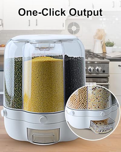 - 【Suitable for Small Grains】WOWFUNNY grain dispenser is designed for bean type grains, such like rice, millet, mung beans, red beans, barley, oat, etc. Please Note: It's not suitable for oatmeal, flour, or larger cereals., 【Space Saving】One rice dispenser replaced 6 containers which saves lots of space in small kitchen area. The 6-grid rice dispenser requires less storage space to keep grains organized and neat. Say goodbye to tons of bags of different grains in pantry., 【360° Rotation】The rice container can be rotated 360 degree smoothly to see and get what slot items we need to get it to cook. Each slot has unique button to get the stored grains easily. Very easy to dispense and refill., 【Convenient and Mess】One dry food dispenser stores grains rather than 6. It is convenient to take the grain out by pressing the button. The storage capacity is about 420 fl oz., 【Food-Grade Material】The rice containers are made of food grade PP material. And the food storage container body are sturdy enough for long-lasting use.
