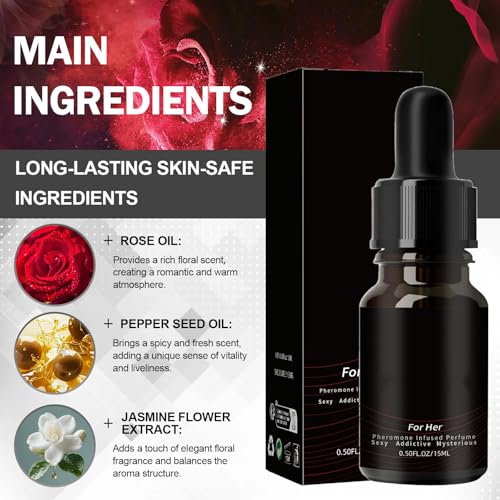 - Women Perfume with Pheromones: This pheromones perfume for women comes infused with Rose and jasmine scent, enhances your natural allure with a subtle yet captivating scent, uplifting and alluring properties, helping you stand out and enhance your allure and confidence, Natural Formula Composition: This venom pheromone perfume for women has top notes of Grapefruit and Jasmine, middle notes of Rose, Raspberry, and Orchid, and base notes of Musk, intertwined with captivating pheromone scents, creating a rich and alluring fragrance, Safe and Easy to Absorb: A blend of pheromones and skin-safe natural ingredients, this enhanced pheromone perfume is free from parabens, glycerin, and alcohol, the lightly perfume absorbs quickly and leaves the skin soft to the touch, blending with your body's chemistry to deliver scent notes with a delicate and luxurious aroma, Portable and Convenient Design: The dropper design makes our cologne perfumes more economical than a spray, it's easy to apply, small, lightweight and TSA travel ready, enhancing your natural charm and leaving a graceful impression wherever you go, Long Lasting Fragrance: Crafted to leave a lasting impression, this perfume for women envelops you in an emitting a refreshing rose fragrance that endures for 6+ hours, just gently wipe on wrists, neck, collar, behind ears, and the long-lasting fragrance will bring you confidence, encouraging you to shine with grace, Charming Gift Option: Give her a scent that ignites her confidence, use it daily to make her love herself more, and it'll become her secret weapon for attracting others on dates, this gift is the key to helping her connect with herself and others again
