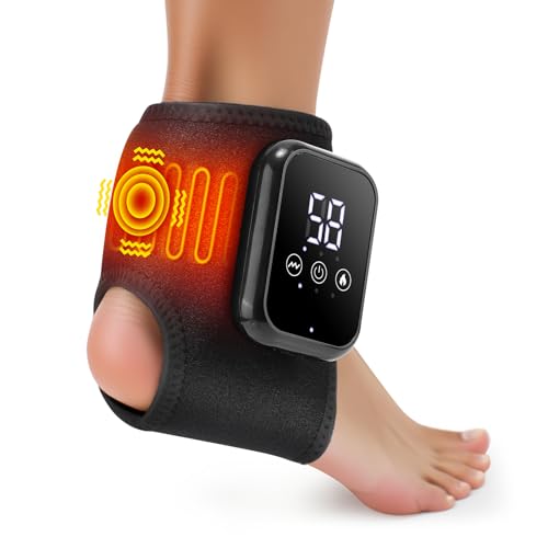 - VERSATILE MODES: Features 3 heat settings and 3 vibration modes for customized ankle therapy and comfort, CONVENIENT FEATURES: Rechargeable battery-powered operation eliminates cord restrictions, with easy-to-use touch controls for seamless operation, ideal for on-the-go use at work, gym, or travel without cable limitations, DIGITAL DISPLAY: LCD screen shows temperature and mode settings, allowing precise control of heat and vibration intensity, SMART CONTROL INTERFACE: User-friendly touchscreen panel with 15-minute auto-shutoff ensures safety and avoid overuse. Using an NTC temperature control technology with a safety chip, this heated ankle brace can protect you from scalding, ERGONOMIC VERSATILITY: Flexible wraparound construction with adjustable fasteners ensures secure, full-coverage comfort for all foot shapes, fits both right and left feet