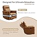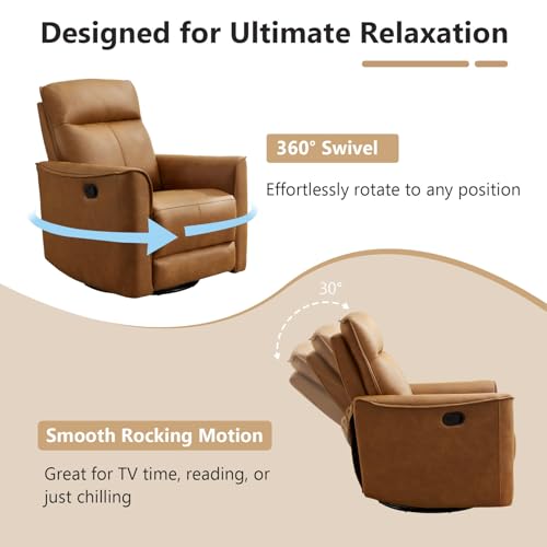 - Overall Dimensions: Please confirm the size and weight information of your leather swivel recliner before placing your order. Overall Size: 31.5"W x 37"D x 40"H, Seat Width & Depth: 21"W x 21"D, Seat Height:19",Expanded Length: 64"L,Net Weight: 79 LBS(36 KG), Maximun load Capacity: 350 LBS(159KG)., 360°Swivel Rocking Recliner: Experience the freedom of 360-degree smooth swiveling combined with a gentle 30-degree rocking motion—perfect for soothing little ones to sleep or finding your ideal relaxation rhythm. The adjustable backrest of the glider rocker recliner seamlessly transitions from 100° to 150°, whether you're sitting upright with a book, reclining for movie night, or fully laying back to unwind with the extended footrest., Premium Leather: Upholstered in innovative triple-defense technology cloth that delivers the luxurious look while offering superior breathability, exceptional durability, and reliable water resistance. This intelligent textile of the soft leather recliner adapts to your lifestyle, standing up to daily wear while maintaining its refined appearance in any setting., Ergonomic Design: Indulge in plush, high-density thick foam cushioning strategically positioned at the headrest, lumbar region, back panel, and armrests. This nursery glider recliner's comprehensive support system cradles your body's natural curves, effectively distributing pressure and eliminating tension for truly relaxation., Robust Construction, Lasting Quality: Built upon a solid hardwood frame reinforced with metal base components and stirrups, this swivel rocker chair delivers exceptional structural integrity. The heavy-duty engineering of the manual recliner supports up to 350 pounds with unwavering stability, ensuring years of dependable use. Assembly takes under 15 minutes with clear, detailed instructions included. Backed by a comprehensive 1-year warranty.