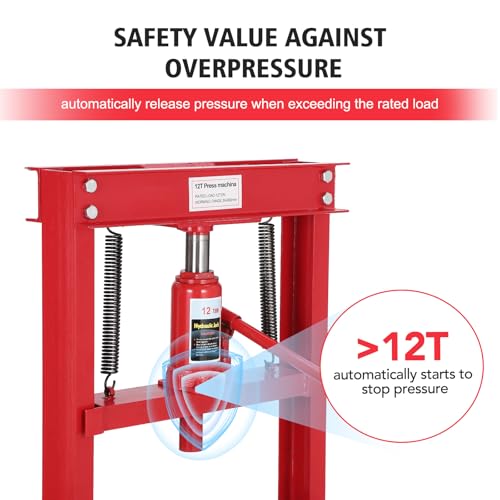 - Powerful 12-Ton Capacity: Featuring a strong 12-ton bottle jack, this hydraulic press simplifies metalworking tasks such as bending, straightening, and stamping. Its consistent performance makes it an essential tool for a variety of metal fabrication projects., Sturdy Material: The H-shaped frame ensures high stability, preventing any wobbling or shaking during operation. Made from durable carbon steel, our hydraulic press is built to last in tough working conditions., Precision Performance: Our hydraulic press includes high-quality precision springs for a smooth and safe return after each press. The polished piston ram resists wear, providing efficient performance. Press or lift the long handle to operate the press easily., Safety Features : Safety is prioritized with a relief valve that activates automatically when pressure exceeds 12 tons, avoiding overpressure damage. Additionally,height-adjustable holes on each side allow you to customize the working table height to meet your needs., Wide Range of Applications: Our hydraulic shop press is designed for versatile use. It's ideal for tasks like metal bending and straightening, with an easy adjustment pin system. The two movable stamping plates keep small parts securely in place during work.