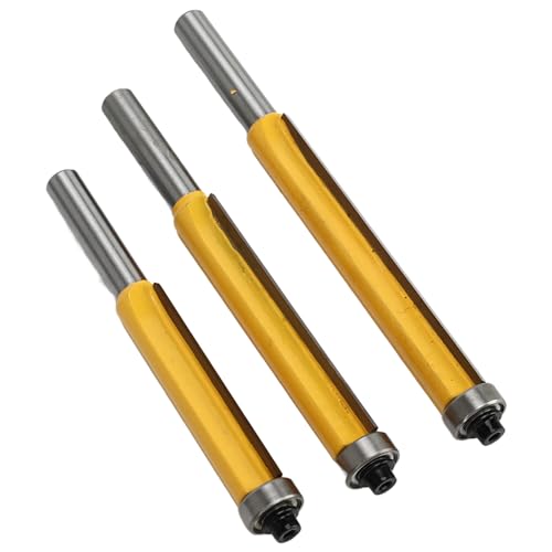 - Precision Flush Trimming: This flush trim router bit set features a straight bearing design that guides the bit along the of your template or workpiece, delivering clean, accurate, and perfectly flush cuts every time—ideal for crafting seamless edges on cabinets, shelves, and furniture., Universal 8mm Shank Compatibility: Each flush trim router bit comes with a standard 8mm shank that fits most tabletop and handheld milling machines, ensuring smooth operation and secure installation without wobbling or slipping during high-speed woodworking tasks., Versatile Woodworking Applications: The flush trim router bit works effectively on a wide range of materials including softwood, hardwood, MDF, chipboard, and dense plywood, making it perfect for DIY projects like kitchen doors, bathroom vanities, wall panels, and custom shelving., Durable Tungsten Steel Alloy Construction: Made from high-grade tungsten steel alloy, these flush trim router bits resist wear, heat, and deformation, maintaining sharp cutting edges longer than standard bits and ensuring consistent performance through repeated use in demanding woodworking environments., Complete 3-Piece Set with Storage: Package includes three flush trim router bits in popular lengths (2", 2.5", and 3") plus three protective plastic tubes for safe storage and transport, giving you flexibility for different trimming depths while keeping your bits organized and damage-free.