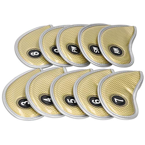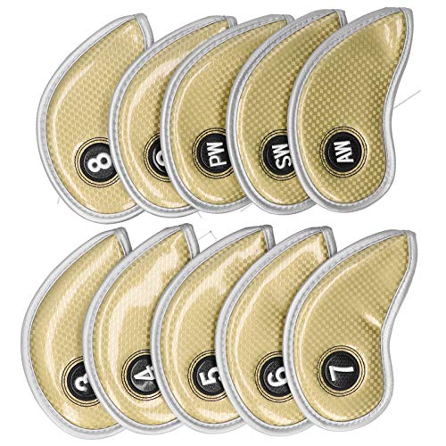 10Pcs Golf Iron Head Covers Sleeve Set, Numbered PU Waterproof Golf Club Headcovers for Irons 3-9 PW AW SW, Soft Protective Golfing Accessory for Left and Right Handed (Gold)
