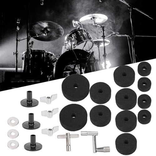 - [Complete Accessory Kit] Each set includes 23 pieces featuring felt pads sleeves nuts and washers. these components work together to secure your cymbals firmly in place ensuring stability and optimal performance during play., [Enhanced Drum Performance] The included sleeves help maintain proper cymbal height and positioning contributing to a well balanced drum set. this setup allows for smoother playability and better sound projection., [Premium Quality Material] This drum felt pad kit is crafted from high class felt material ensuring exceptional durability and strength. the superior quality felt provides excellent protection for your cymbals while enhancing their performance and sound quality., [Universal Compatibility] Suitable for most drum kits this kit comes in standard sizes that fit a wide range of cymbals. the black and gray color options blend seamlessly with any drum set offering both functionality and aesthetic appeal., [Protects Your Cymbals] Designed to prevent direct metal to cymbal contact these felt pads effectively safeguard your cymbals from damage. the soft yet sturdy felt reduces wear and tear prolonging the life of your drum kit components.