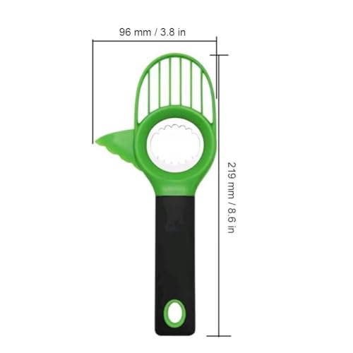 - 1. 3-in-1 Multi-Function Design: This avocado tool combines a serrated fruit tool, a stainless steel pit remover, and slicer in oneeffortlessly cut, pit, and slice avocados in seconds. The integrated serrated edge cleanly splits the skin, while the circular stainless steel core removes the pit with precision., 2. Stainless Steel Plastic Construction: Made of high-quality 304 stainless steel for the pit remover and slicing , paired with BPA-free green plastic body and a soft-grip black handleensuring safety, rust resistance, and long-term reliability., 3. Ergonomic & Practical Handle: Features a comfortable soft-plastic handle with a hanging hole for easy storage; the non-slip grip provides control during use, reducing hand fatigue even with repeated slicing., 4. Precise Slicing & Easy Core Removal: The 6 evenly spaced slice avocado flesh into uniform, ready-to-serve strips in one press, while the scalloped stainless steel ring securely grips and extracts the pit without crushing the fruitideal for salads, toast, or sushi prep., 5. Compact Size for Everyday Use: Measures 219 mm × 96 mm (8.6" × 3.8")perfectly sized for kitchen drawers, travel, or meal prep; lightweight yet sturdy for daily avocado handling.