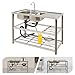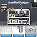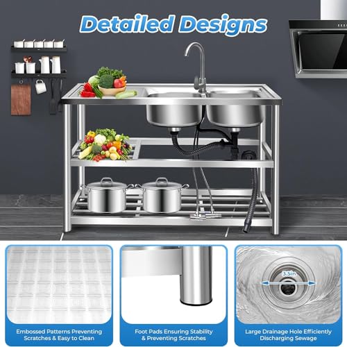 - Practical and Adjustable Faucet: This 360° Rotating Faucet features hot and cold water inlets and a single handle for easy temperature and flow adjustment, providing versatility for washing at various angles and temperatures. The rounded corners and smooth surface make cleaning effortless, ensuring a stylish and functional addition to your Kitchen or Bathroom., Complete Set: This Sink Kit includes 2 Sinks, 1 Faucet, 3 Drain Pipes, 2 Drain Passages, 2 Water Inlet Hoses, and all necessary accessories for easy installation. Save time and effort by having everything you need in one package, perfect for your Kitchen or Bathroom Renovation. Enjoy a seamless setup with our comprehensive solution for your plumbing needs., Spacious and Practical: Featuring two large sinks measuring 13 * 13 * 7.1 inches, this Kitchen Sink set accommodates big bowls and dishwashing needs. The ample countertop space is ideal for daily food preparation, while the lower shelves provide convenient storage for kitchen utensils and tools, enhancing your Cooking experience., Made from high-quality 201 Stainless Steel, this Sink features an elegant design with a polished finish. It is durable, rust-resistant, and can withstand high temperatures. The Rectangular Design, along with thick Square and Round Pipes, ensures the countertop supports up to 220.5 lbs, while each shelf holds up to 55.1 lbs without risk of collapse. Perfect for your kitchen or utility space., User-Friendly Design: With a comfortable height of 31.5 inches, you can say goodbye to bending while washing dishes. The Enhanced Drain Opening ensures quick drainage to prevent clogs. The Basket with a Lid keeps large debris from blocking the pipe and simplifies water storage. Ideal for Kitchen and Home Use, this product combines convenience and efficiency for your daily tasks.