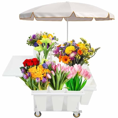 - Three-tiered trapezoidal flower stand featuring 18 individual pots for a clear, unobstructed display of plants, maximizing space and organization., Designed with an integrated parasol to shield plants from UV rays and prevent water accumulation, ensuring protection against harsh weather conditions., Equipped with 4 swivel wheels, including locking mechanisms, for effortless 360-degree movement and flexible positioning to suit any display need., Constructed from durable, thickened metal with a reinforced base for superior stability and load-bearing capacity, suitable for both indoor and outdoor use., Includes a foldable side workbench that expands to provide ample workspace for arranging flowers and packaging, then tucks away neatly to conserve space when not in use.