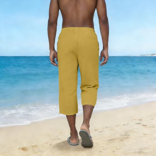 UHBYGV Mens Summer Cotton Linen Capri Pants Casual Baggy Straight Drawstring Elastic Waistband Yoga Beach Pants with Pockets Yellow