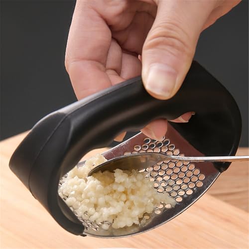 - Experience the easiest way to mince garlic. Our innovative rocker design requires just a gentle back-and-forth rocking motion to crush cloves completely, eliminating the need for forceful pressing. The ergonomic handles provide superior leverage and comfort, making it for users of all strength levels. Transform whole garlic into fine mince in seconds without any strain on your hands or wrists., Built to last a lifetime with high-quality, food-grade stainless steel. This material ensures exceptional durability, resists rust and corrosion, and will not absorb odors or flavors. Unlike cheaper aluminum or plastic presses, our sturdy construction guarantees safe contact with your food and withstands daily use without bending or breaking, making it a reliable kitchen companion., The uniquely curved, arc-shaped pressing chamber is designed for maximum efficiency. After mincing, simply use the included cleaning tool or a spoon to effortlessly scrape every bit of minced garlic from the smooth interior surface. This thoughtful design ensures you get all the flavorful garlic paste without waste, saving money and ingredients over time., Cleaning is quick and simple. Rinse the press under running water; the optimally sized holes prevent clogging and allow pulp to rinse out easily. Its compact and sleek design takes up minimal drawer space. The smooth surfaces and lack of complex mechanisms mean no trapped food particles, promoting better kitchen hygiene and convenience., Beyond garlic, this press is ideal for mincing ginger, crushing nuts, making pastes from small onions or shallots, and even creating herb-infused oils. Keep your hands clean and odor-free while speeding up meal prep. It’s an indispensable tool for home cooks and professional chefs alike, enhancing flavor and efficiency in every dish you create.