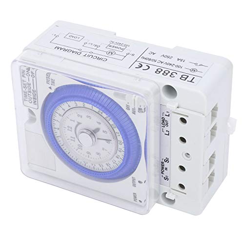 - Feature & Technology: The TB-388 Time Switch is a programmable quartz-controlled stepper motor timer, offering Precision Machined and stability with a 100-240VAC input. Designed for 24-hour scheduling, it seamlessly operates various appliances., Efficient Power Management: This timer allows for up to 8 programmable settings to efficiently control electrical devices within a 24-hour period and 48 settings weekly, effectively managing power consumption and reducing loads., User-Friendly Design: The TB-388 features a compact and attractive DIN rail design for easy installation in any home setup. Its synchronous pulse motor technology ensures strong -interference capabilities for performance., Versatile Applications: Ideal for automatic control of heaters, drinking fountains, street lights, staircase lights, advertising displays, and agricultural irrigation systems, making it a choice for both residential and commercial use., Energy Savings & Sustainability: By optimizing operational schedules, the TB-388 helps to achieve energy savings, making it an solution for managing power in your home or business.
