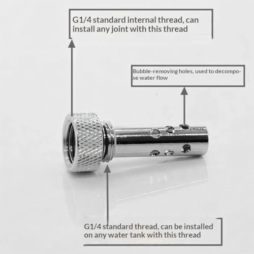 - Featuring an extended exhaust channel design compared to standard models, this bubble remover provides superior air expulsion for complex cooling, Ideal for enthusiasts and customizable water cooling builders seeking optimal thermal management solution, Crafted from durability, metal materials, this plug and play bubble trap ensures long term reliability in most common water cooling configurations, air bubble efficiently with this specializing water cooling reservoir, significantly enhancing your device thermal and cooling efficiency, Low-noise operating to produce low noise during operating, which will not affect the user ' s and is suitable for work or entertainment in a quiet environment