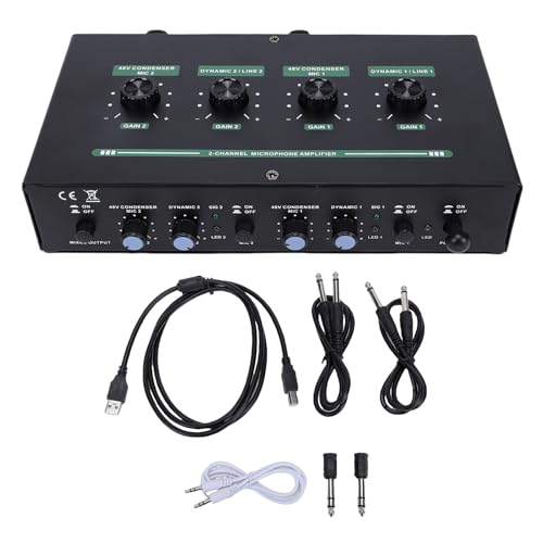 - Dual-Channel Independent Control: Adjust each microphone/instrument input volume separately with dedicated knobs for precise sound mixing. Supports 2 XLR (48V power) and 2x 6.35mm inputs, ideal for condenser mics, guitars, and wireless systems., Ultra Clean Audio With Noise Isolation: Advanced power boost & signal isolation technology eliminates ground loop interference, delivering studio-grade clarity. 50dB gain & +48V power ensure lossless amplification for professional recordings., Multi-Device Compatibility: Works with condenser mics, dynamic mics, instruments, and wireless systems. Outputs include 2x 6.35mm & 1x 3.5mm mixed output for headphones, speakers, or audio interfaces., Immersive RGB Lighting & Dual Reverb: Features glowing RGB knobs with customizable colors for a vibrant studio aesthetic. Supports dual-channel reverb effects for richer vocal/instrument output., Wide Frequency Response & High Gain: 5Hz-50kHz range captures deep lows and crisp highs. Up to 60dB mic gain & 40dB line input boost for powerful, distortion-free sound reinforcement.