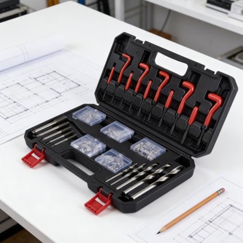 - Efficient Thread Fixing: Designed for mechanical vehicle maintenance, this thread repair kit incorporates a multi-size tap socket set with broad common thread size coverage, providing improved convenience when restoring stripped or damaged threads in vehicles, machinery, or other equipment requiring dependable threading solutions, Long-Lasting Edge Design: The engine thread repair kit features stable metal tapping performance, providing high hardness and wear-resistant properties for long-lasting edges, making it suitable for automotive repairs and maintenance tasks where reliability is important, Magnetic Socket Design: Designed with a magnetic socket feature, this automotive thread repair set allows for quick alignment placement, streamlining useal efficiency in confined spaces, providing seamless usability for intricate automotive maintenance work, Shock Protection Management: The threaded insert kit is equipped with a particular case providing compartmentalized organization, reducing the risk of component loss or damage due to shocks, making it suitable for outdoors workshops, Thread Repair Solution: Designed to address worn or stripped holes, the thread repair kit included in a portable case provides fastening strength recovery, supporting efficient engine bracket maintenance and providing a practical solution for automotive workshops and field repairs