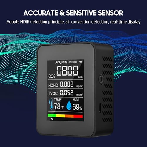 - 【Multi-Function Air Quality Monitor】 This is a 5-in-1 indoor air quality monitor that accurately detects carbon dioxide (CO2), formaldehyde (HCHO), volatile organic compounds (TVOC), temperature, and humidity in real time. It helps you stay informed about the air quality in your living environment at a glance., 【Smart LED Color Screen】 Air quality tester equipped with a high-definition color screen for real-time data display, making it clear and easy to read. It provides an overall assessment of environmental quality and tracks the average value of each gas, helping you quickly identify unsafe gases in the air. In alarm mode, the screen changes color to remind you to pay attention to the environment., 【High Accuracy and Reliability】 Home air quality test built with high-performance chips and advanced infrared (NDIR) sensor technology for CO2 detection, as well as electrochemical sensors for HCHO and TVOC. It is more sensitive, accurate, and stable compared to ordinary sensors., 【Simple Operation】 Air quality sensor press and hold the "Power" button for 3 seconds to turn the air quality monitor on or off. Once powered on, it automatically starts detecting. The default temperature unit is Celsius (℃).When you need to switch the temperature unit, just click the button, and the temperature display will switch from Celsius(℃) to Fahrenheit(℉)., 【Long-Lasting Battery, Portable Design】 Air monitor equipped with a built-in 1200mAh rechargeable lithium battery and a USB charging cable, it can last up to 8 hours on a single charge. Its lightweight and portable design make it suitable for various scenarios.