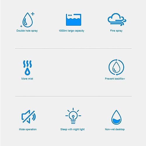 - Colorful atmospheres lights, help create romantic and cozy atmospheres, and you can enjoy restful sleep., Nanometer fine mist humidification, fine cold mist, reduce the weight of a single water mist, and do not wet the desktop., 30dB mute humidification, it will not disturb the normal work and sleep., The dual‑hole spray works at the same time to humidify, and the speed is 2 times faster than ordinary humidifiers, and the humidifying effect is more obvious., Large capacity of 1000ML, one time adding water can assure long time humidification, no need to add water frequently.