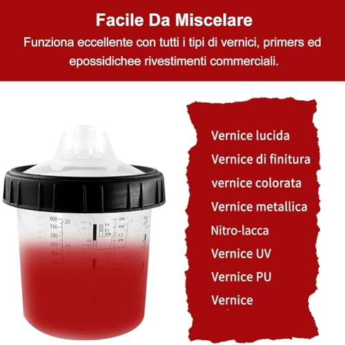 - Threaded connection guarantees 360° spraying without leakage and precise control of the volume even when spraying upside down. and the modular structure of the disposable paint cups supports color change in the middle of the process, Disposable cup liners can be replaced as needed, eliminating the need to wash and saving up to 90% of cleaning agent consumption. The unused paint can be stored use the sealing plug, and the 125 filter realizes a smooth and particle-free paint , reducing the loss of reworking, Paint cups realizes the integrated operation of mixing, spraying, refinishing and storage. The paint mixing cups is equipped with a precise scale, which can monitor the liquid level visually and simplify the process of mixing resins, automotive paints and other materials, Suitable for hvlp and lvlp models, the kit includes male/female connector (16mmx1.5mm), 14.1mm connector adapters. It is not only compatible with regular car paint kit, but also meets the operational of mini, Double reinforced hard cups + non-slip fixing ring design, still maintains a stable connection in case of collision. It can be quickly disassembled and replaced in case of emergency, and the spill-proof structure ensures a tidy working environment